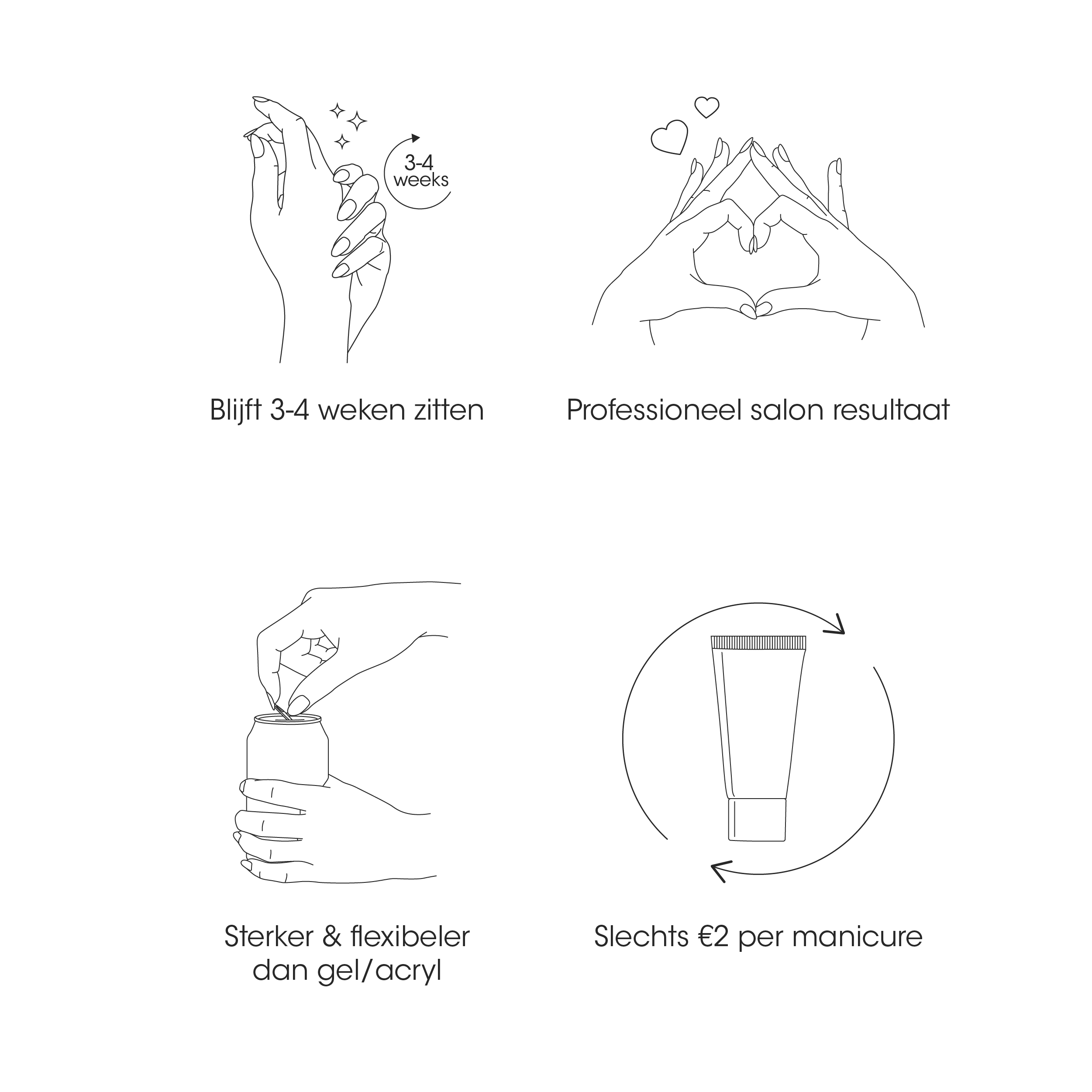 Onze polygel blijft 3+ weken perfect zitten zonder scheuren en breuken. De formule is krachtig én flexibel en kent een langere duurzaamheid dan reguliere nagelverlengingen.